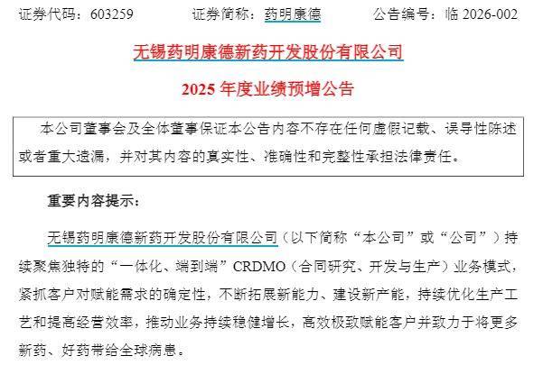 【大河财立方消息】1月12日点登富,无锡药明康德新药开发股份有限公司(证券简称:药明康德)披露2025年度业绩预增公告。