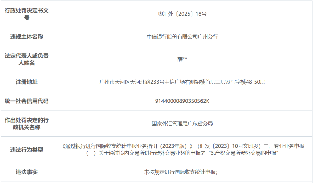 11月27日,国家外汇管理局广东省分局行政处罚信息公示显示,中信银行广州分行因未按规定进行国际收支统计申报被警告、罚款6万元。